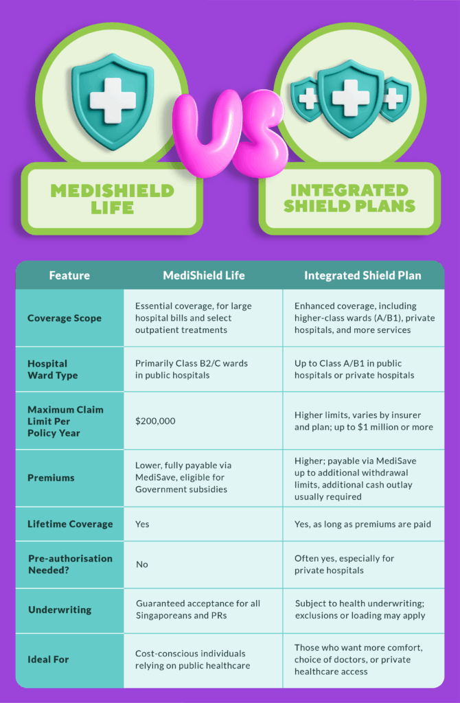 Now, if you’re someone who’d rather have a bit more atas care, like single-bed wards, being able to choose your own doctor, or private hospitals, then Integrated Shield Plans (IPs) could be worth considering. IPs layer on top of MediShield Life and let you choose your care level – like upgrading from a basic umbrella to one of those fancy ones with wind resistance and UV protection.